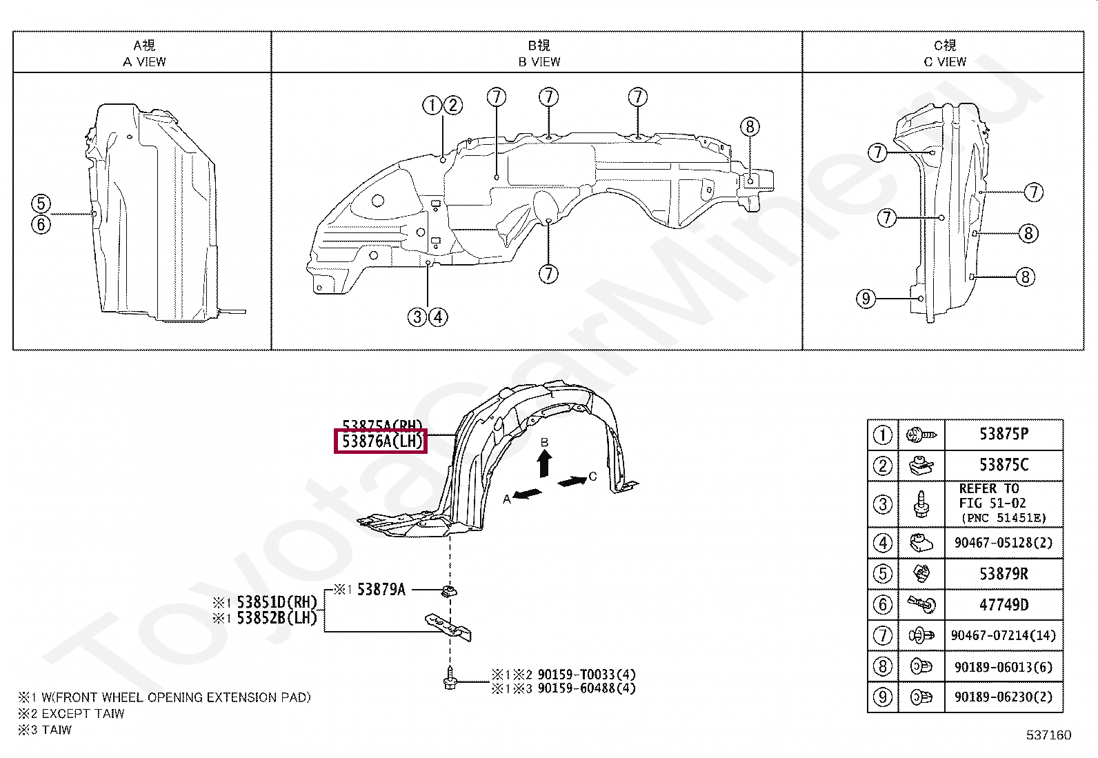 53876-0D310, LINER, FRONT FENDER, LH