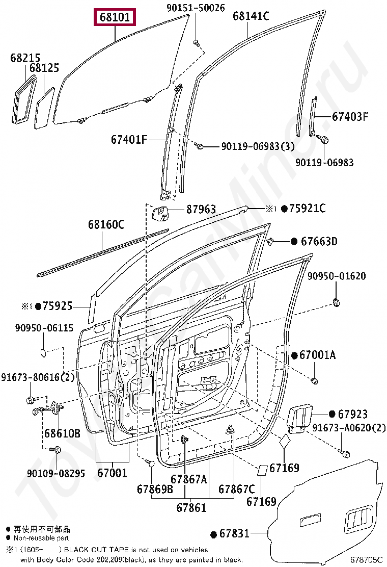 68101-52110, GLASS SUB-ASSY, FRONT DOOR, RH