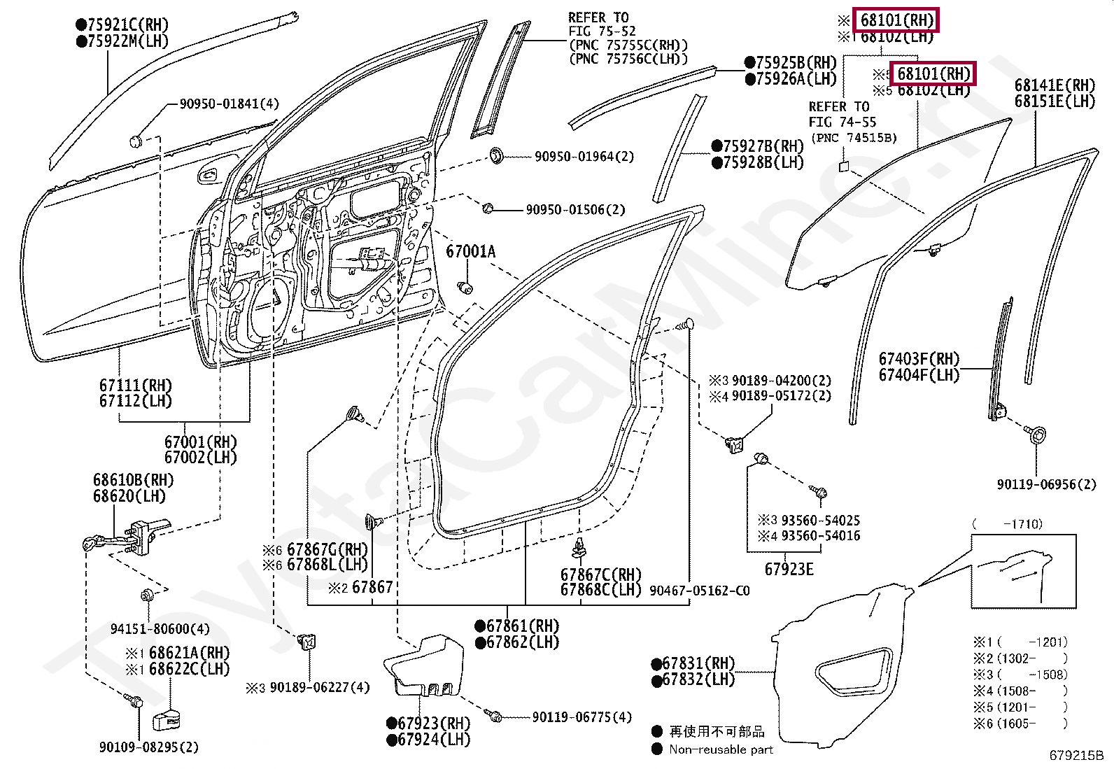 68101-60730, GLASS SUB-ASSY, FRONT DOOR, RH