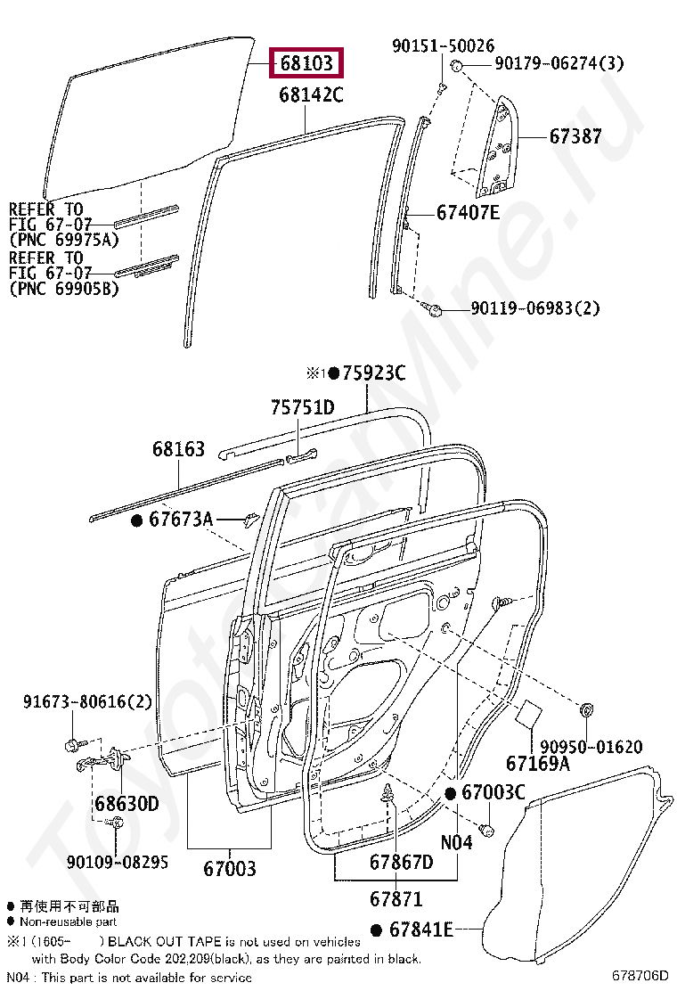 68113-52390, GLASS SUB-ASSY, REAR DOOR, RH