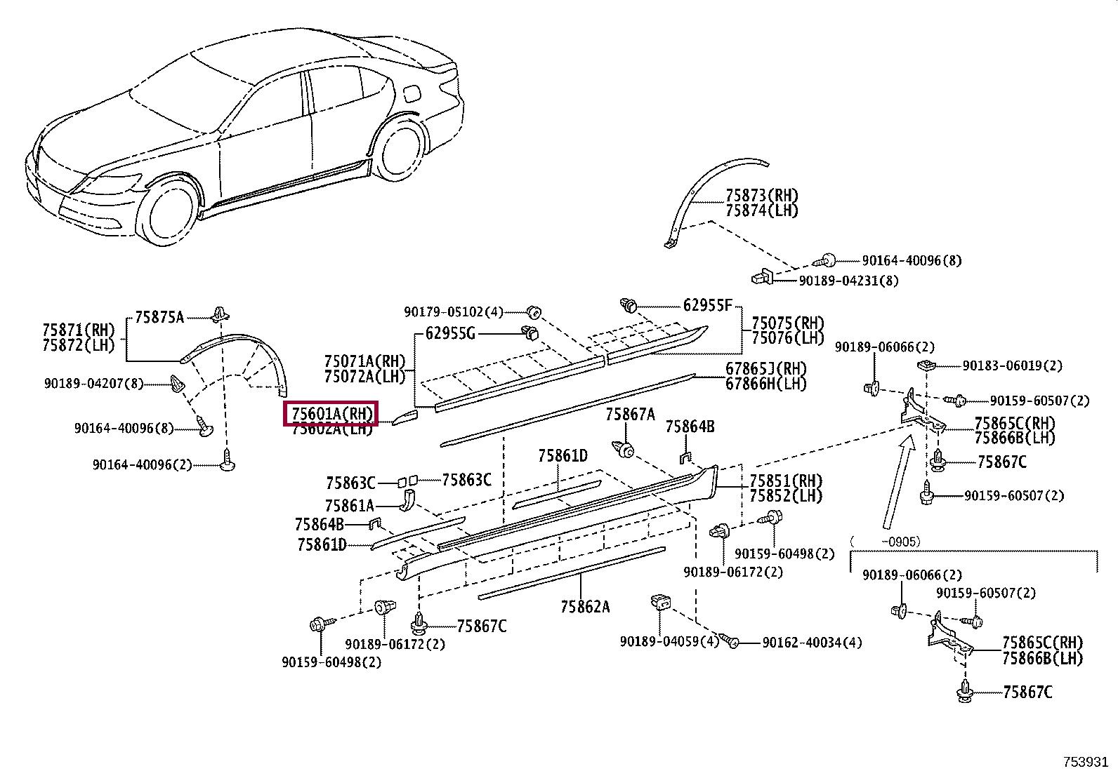 75601-50071-C0, MOULDING SUB-ASSY, FRONT FENDER, RH