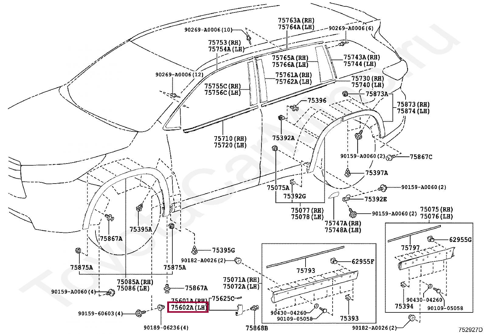 75602-0E903, MOULDING SUB-ASSY, FRONT FENDER, LH