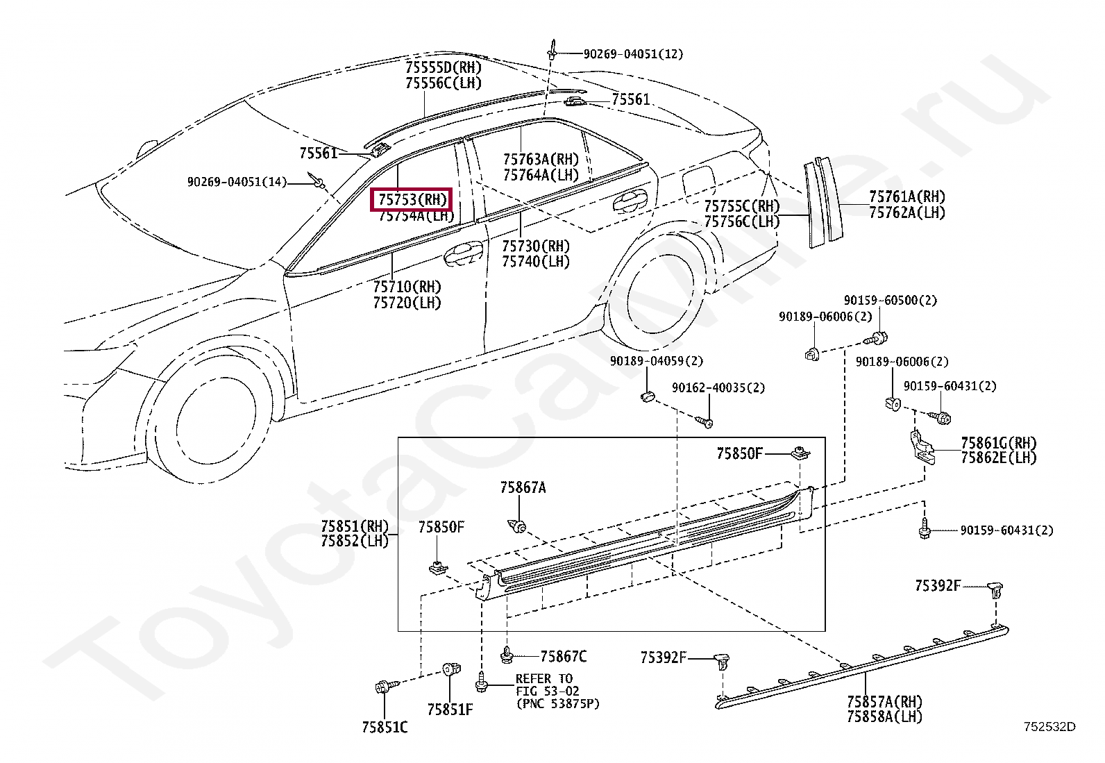 75753-06080, Молдинг передней правой двери верхний