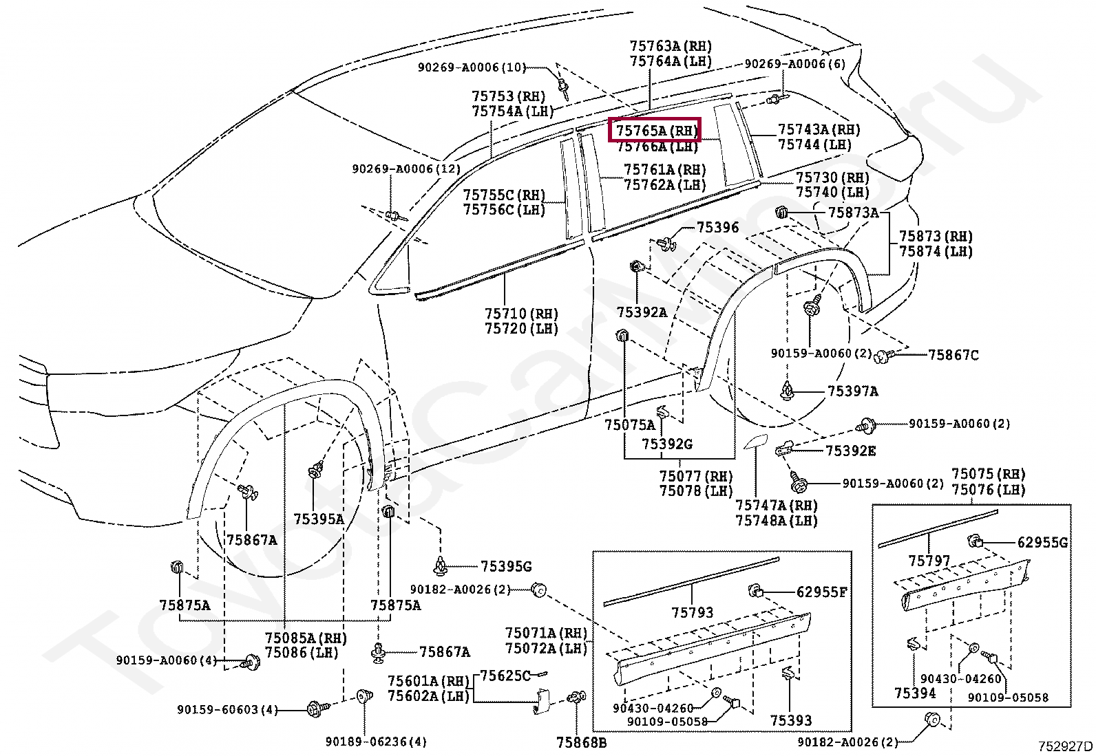 75765-0E020, MOULDING, REAR DOOR WINDOW FRAME, REAR RH