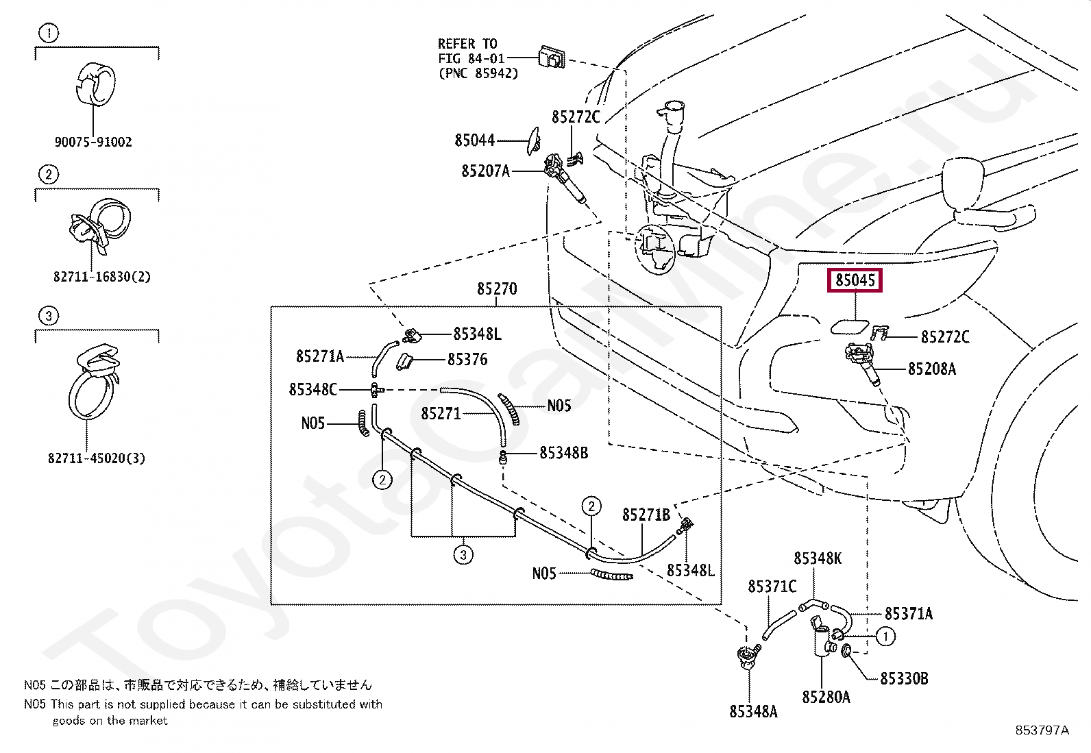 85045-60190-E0, NOZZLE SUB-ASSY, TYPE1 H/LAMP WASHER, LH
